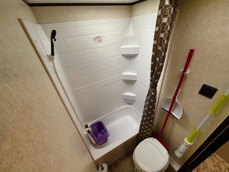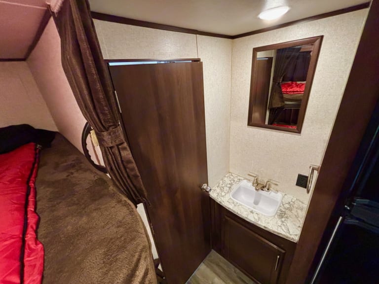 4-burner stove & oven. Oversized fridge (runs on hydro or propane — great for dry camping with battery support). Microwave. Double sink. Fully stocked with pots, pans, dishes, and cutlery.