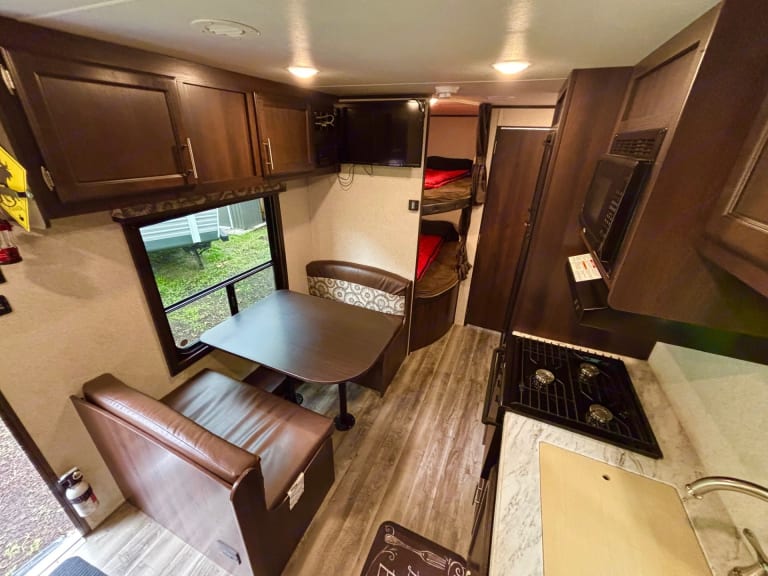 Dinette seats up to 4 and converts into an extra sleeping space. Open layout for easy movement and group activities.